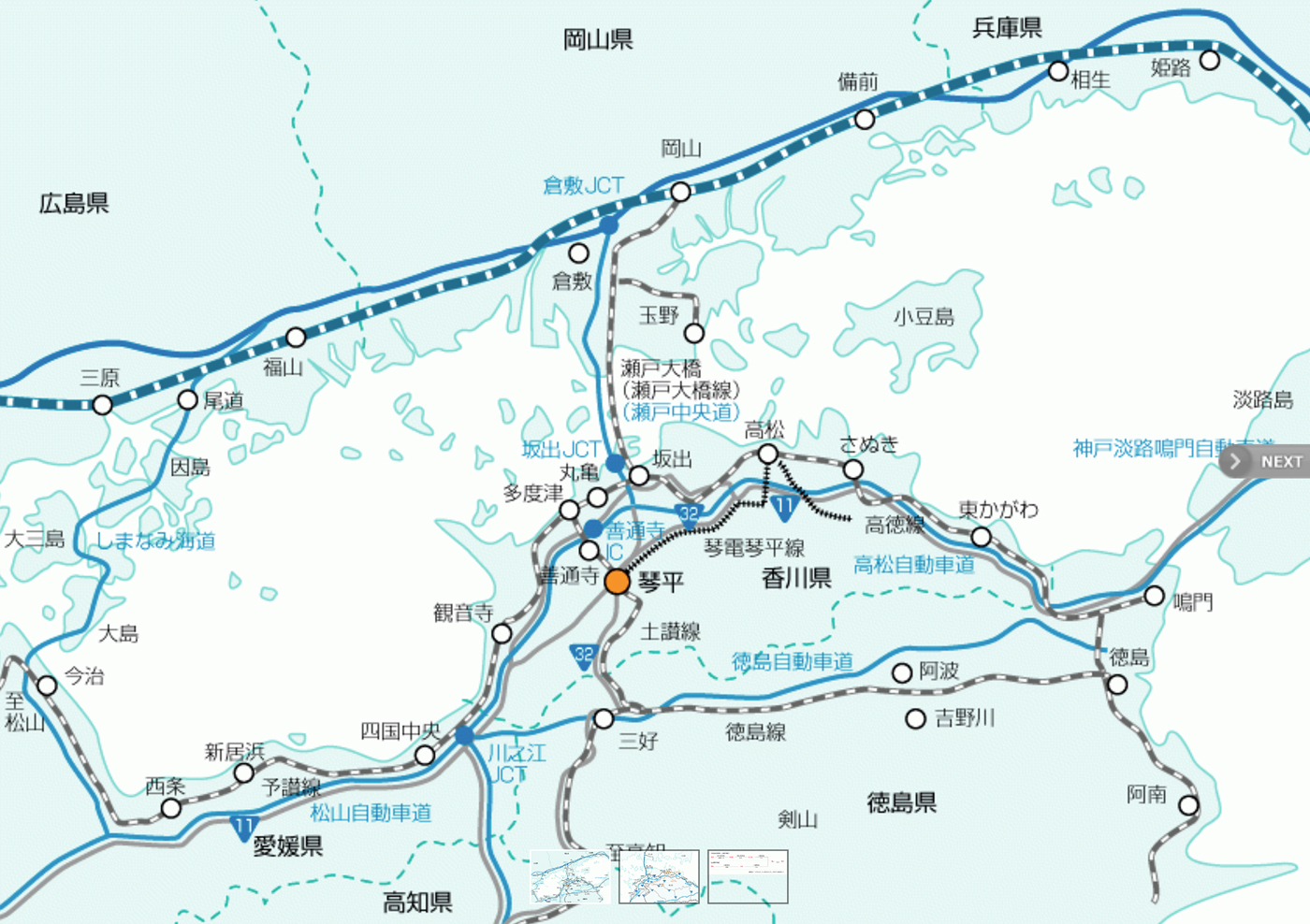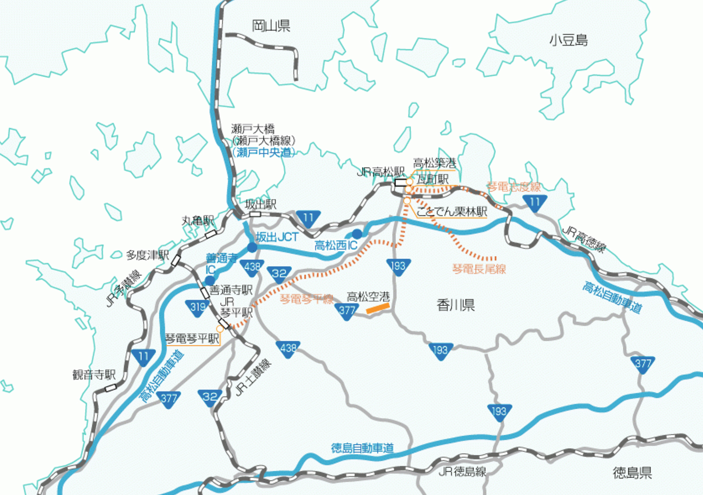 | 岡山方面 | 瀬戸中央自動車道 → 高松自動車道 → 善通寺IC | 約15分 |