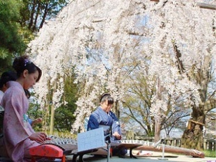 本殿では舞が奉納されます。桜の小枝で飾られた海川山野の神饌を奉り、斎主が祝詞を奏上し、続いて「大和舞」(やまとまい)、「八少女舞」(やおとめまい)を奏進し、奏楽の雅な音色が琴平に春の訪れを知らせます。