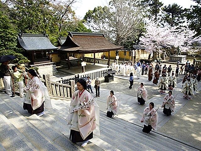 神慮を慰める神恩感謝の祭で、神職と巫女の行列が、伶人の奏楽のもと、神職は冠に桜の花を差し巫女は桜の枝を手に持ち、行列をなして大門から御本宮まで優雅に参進します。
