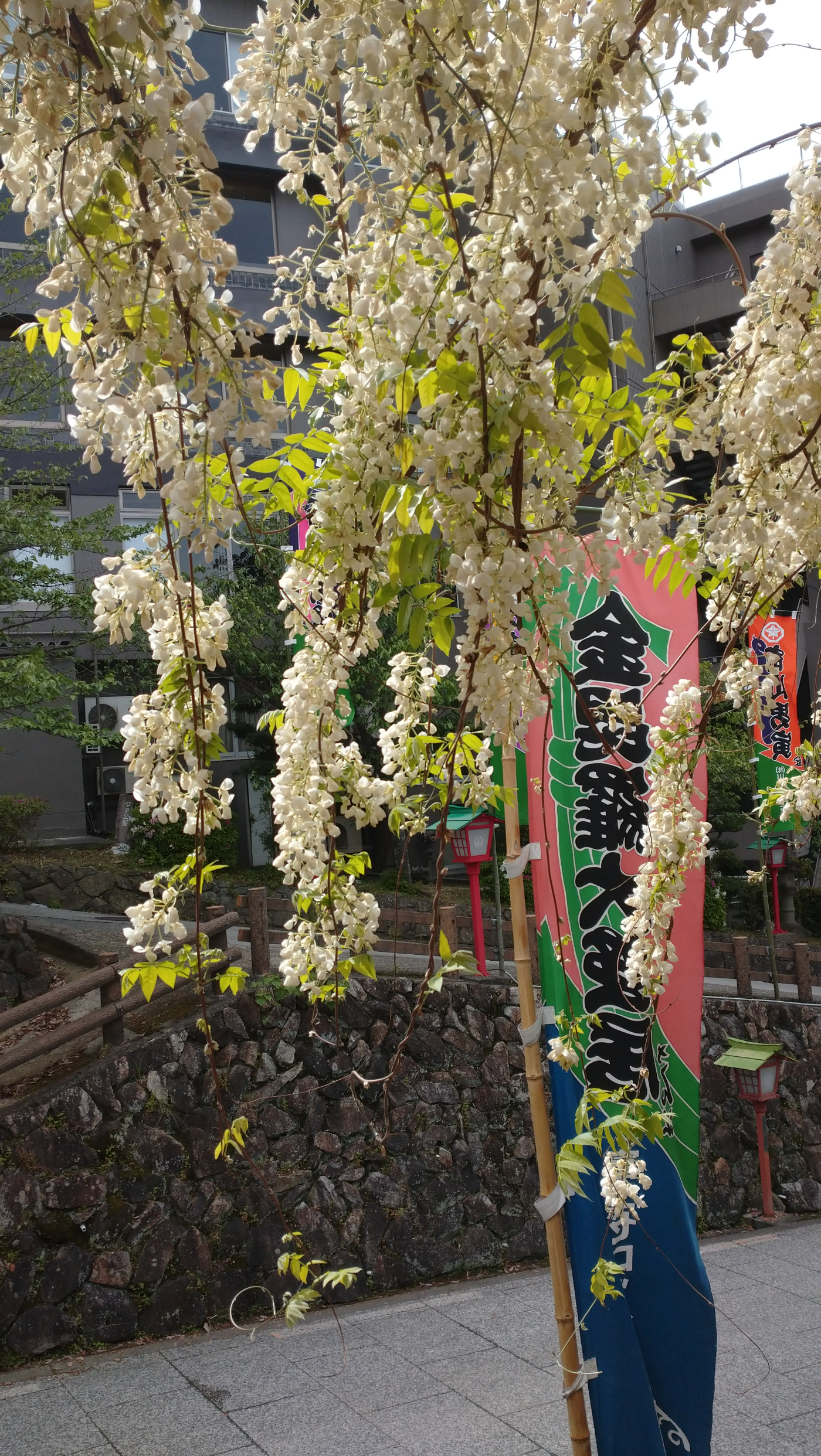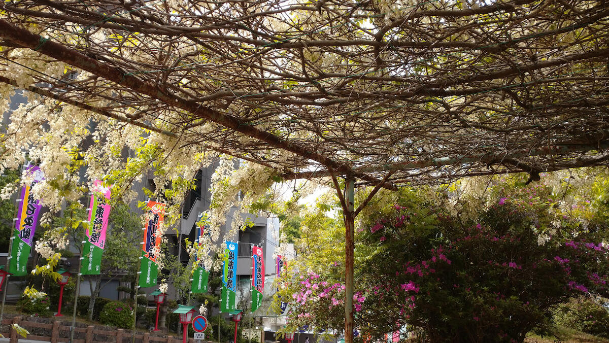 公会堂の藤は白藤です。白い藤の花は、紫色のフジに比べて見かける機会が少ない、上品で希少な花です。特に「白野田藤(しろのだふじ)」や「白長藤(しろながふじ)」が知られ、香りが強く、白無垢のような可憐な雰囲気があります。琴平では 四国こんぴら歌舞伎大芝居が開催される4月中旬〜4月下旬頃に見頃を迎えます。歌舞伎にいらっしゃる方は、坂道を上る途中、ちょっと左側の藤棚に目をとめてみるのはいかがでしょうか?きれいな香りとともに白い美しい花が楽しめます。
