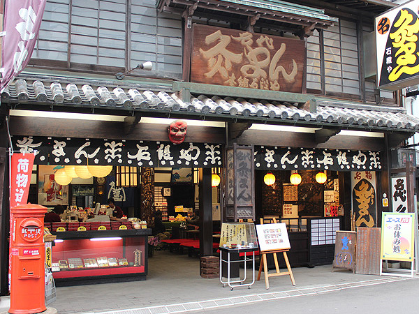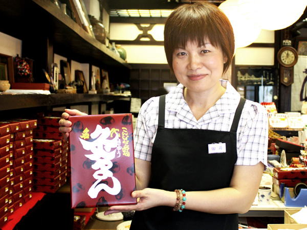 「金毘羅で一番有名な、『名物 灸まん』でございます。店内にてお茶も飲めます」と声掛けするお接待の気持ちとレトロな雰囲気は金毘羅ならでは。