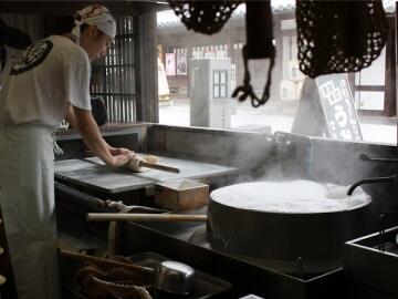 職人の手さばきや、大釜にたっぷりのお湯の中で対流し、茹で上がると透き通った「角」が立った麺など、見た目の美味しさもご堪能ください。